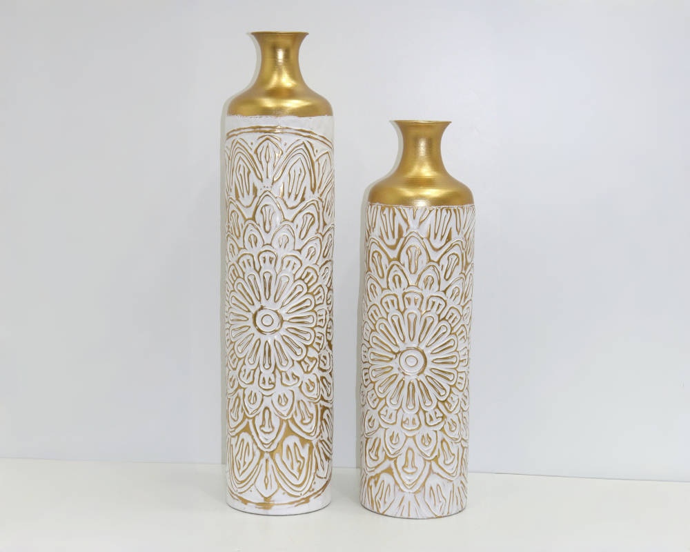 Each vase in our collection boasts unique design elements that set it apart. The resin material allows for intricate details and durable construction, while the metallic finish adds a touch of luxury and reflects light beautifully. The varying heights and widths of the vases in each set create visual interest and balance when displayed together.