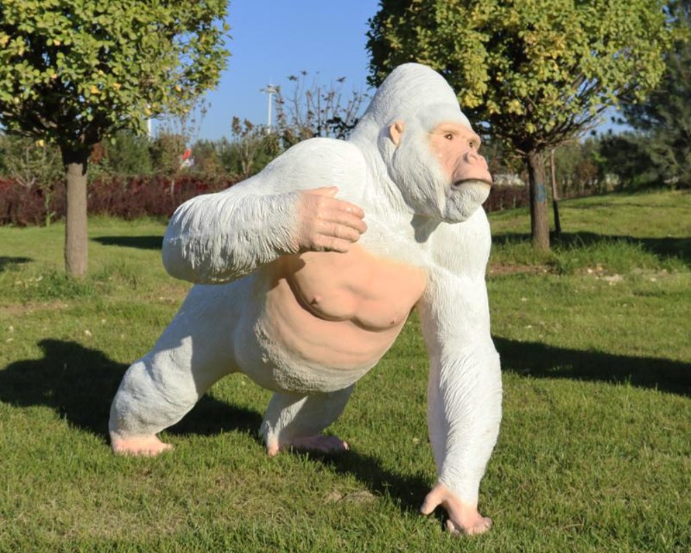 As a symbol of strength and wisdom in nature, the life-size simulation gorilla sculpture accurately reproduces its charm in fiberglass. With a black and white two-color design, the black model shows the heaviness and majesty of muscles, while the white model conveys the mysterious temperament of the gorilla. Whether it is a single display or a group combination, we are committed to bringing the raw power and elegance of nature into your space through simulation fiberglass gorilla sculptures. These sculptures are designed with attention to detail, capturing the essence of gorillas, and perfectly combining realism, artistry and durability. Whether you are looking for a theme park centerpiece or a unique landmark in a commercial plaza, our simulation gorilla sculptures can exceed your expectations.
